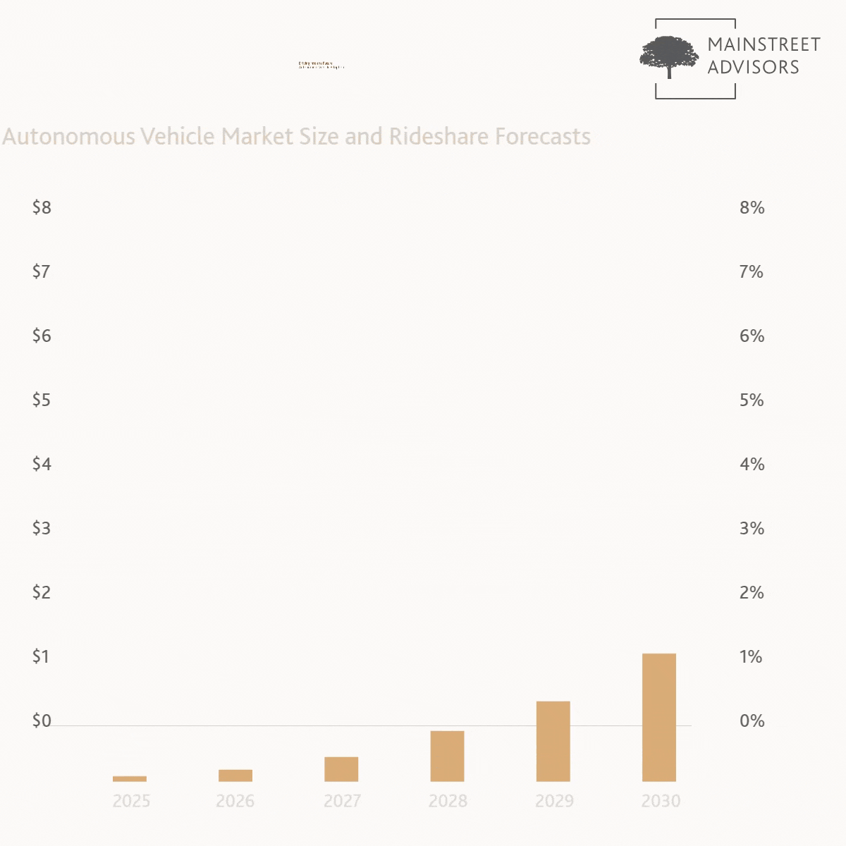 According to Goldman, the AV market could reach $7 billion in revenue by 2030 and include 8% of the U.S. rideshare market, up from less than 1% of the current market. Presently, there are only 1,500 commercial AVs in five U.S. cities. The forecasted growth for robotaxis in the ridesharing market is 90% from 2025 to 2030.