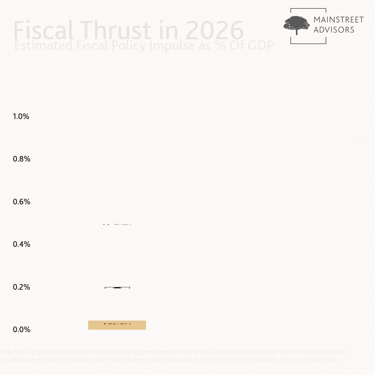 Note: Fiscal impulse calculated using cyclically adjusted primary balance for Japan and Germany, and the estimated Impact of the OBBBA from the CBO.