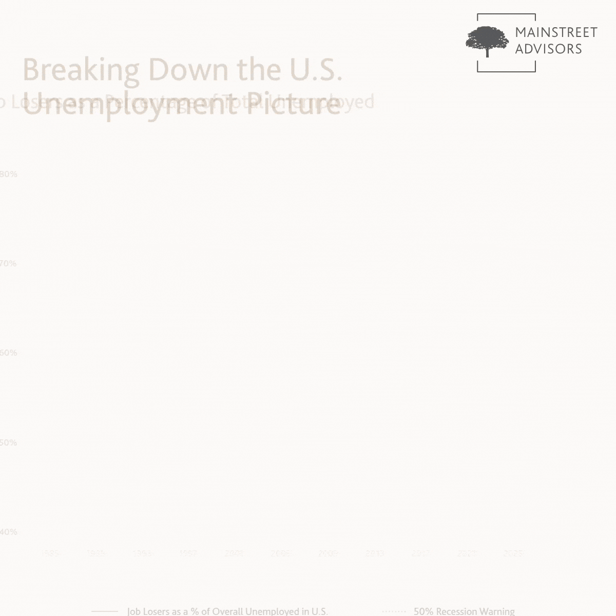 During prior periods of domestic economic stress (1991, 2001, 2008-2009, and 2020), the percentage of “job losers” rose above 50%-52% as the U.S. unemployment rate climbed against a recessionary backdrop.