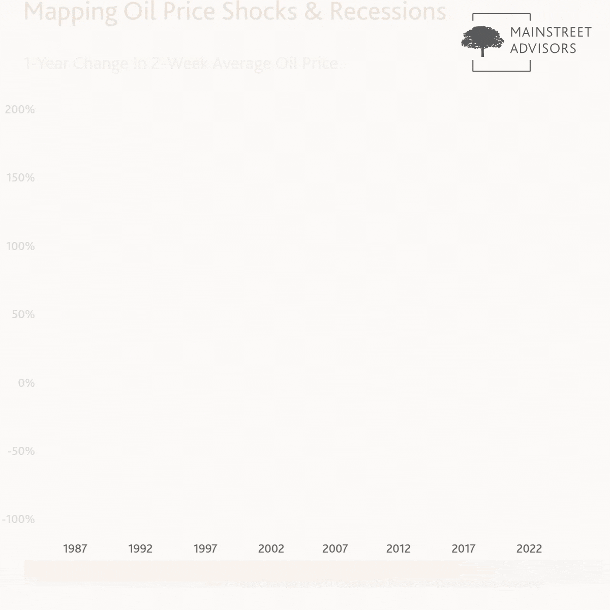 This week’s chart tracks the 1-year change in WTI crude oil prices (14-day moving average) against U.S. recessions. Historically, a 50%-plus year-over-year surge in oil prices has served as an important psychological and economic “warning zone” for market participants, signaling potential distress.