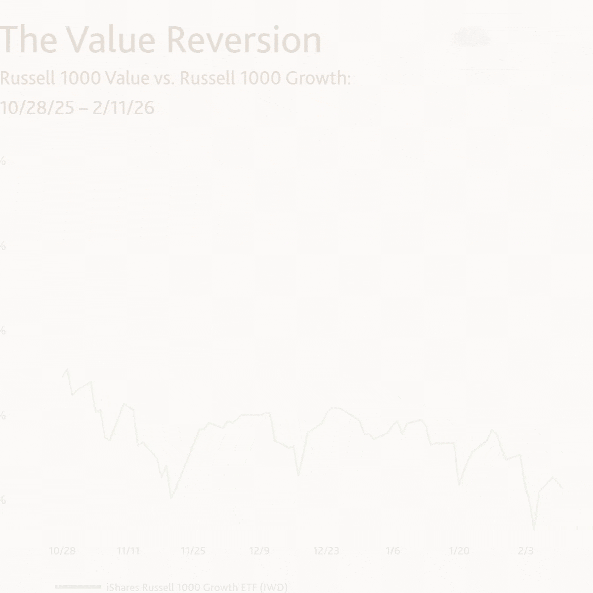From October 28 through February 11, the iShares Russell 1000 Value ETF (IWD) outperformed the iShares Russell 1000 Growth ETF (IWF) by 15.5%, marking a notable shift in leadership beneath the surface of headline indexes.