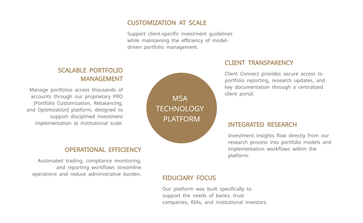 Client Connect simplifies the operational workflow between your team and MainStreet Advisors, allowing portfolios to be monitored, updated, and implemented efficiently every day.